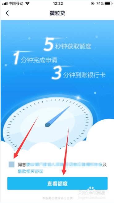 然后需要先赞成相关和谈,接着点击“查看额度”,就可以看你能告贷的额度,如图所示。