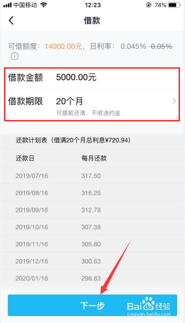 然后输入告贷的金额,以及选择告贷的刻日,然后点击“下一步”即可,如图所示。