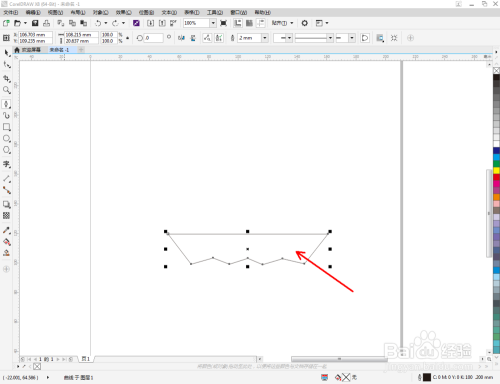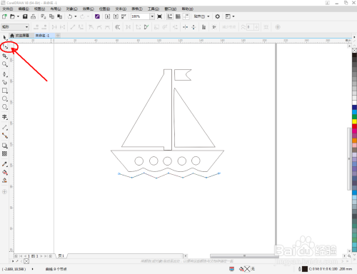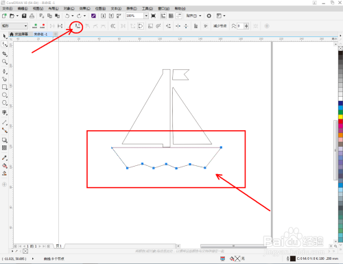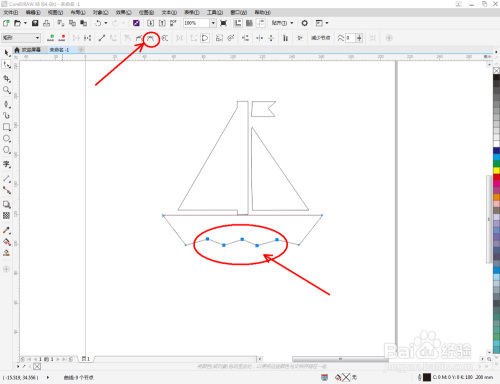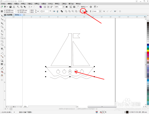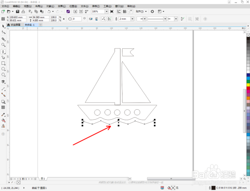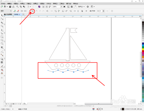 点击【卵形东西】,在图示区域绘制4个圆形图案并调整好圆形图案的位置。点击【钢笔东西】,在风帆本家儿体图案下方绘制一个线段图案。点击【外形东西】对线段图案上的点进行光滑处置(如图所示);