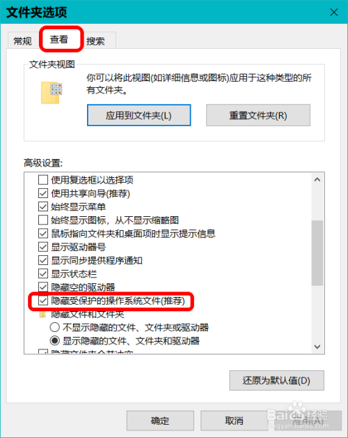 在打开的文件夹选项窗口中,我们点击【查看】,在【高级设置】框中可以看到:埋没受庇护的操作系统文件前面复选框内打了☑;