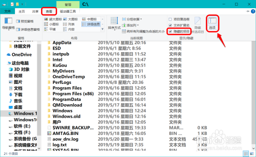 在资本办理器中进入系统C:\盘,点击【查看】-【埋没的项目】-【选项】;