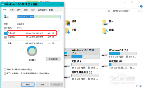 同时我们在系统 C:\的属性窗口中可以看到 已用空间为:44.1GB。