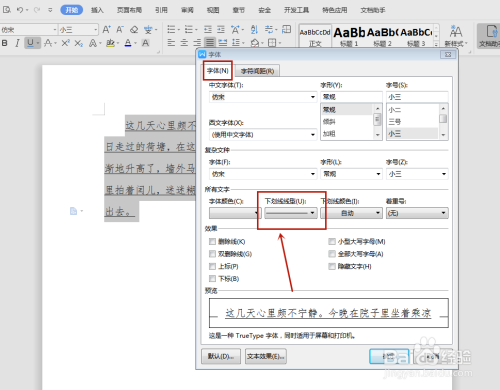 这时弹出“字体”对话框,我们可以看到鄙人划线类型中,是设置了下划线的。