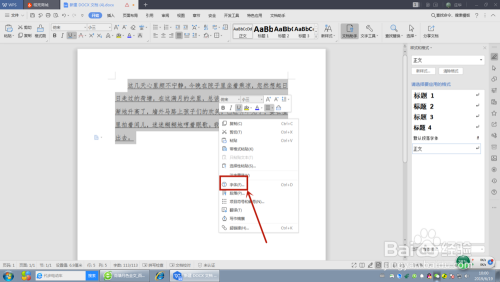 选中需要去失落下划线的文字,点击鼠标右键,选中“字体”选项。