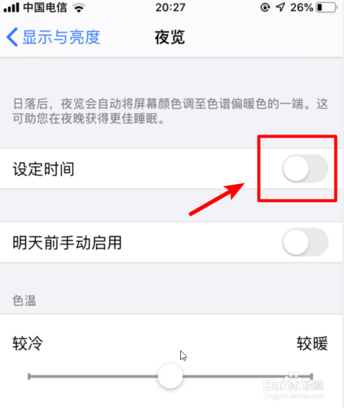 进天黑览设置界面,我们点击设按时间后方的开关。