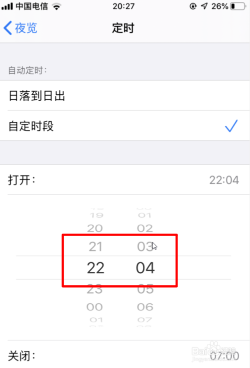 经由过程滑动打开时候和竣事时候及可自界说设置苹果手机的夜览时候。