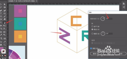 随后,将绘制好的字母,别离放置到六边形上的三个位置,在双方的字母选择“倾斜东西”,对齐进行“30°”和“-30°”的倾斜操作,上面的字母,选择扭转“45°”。