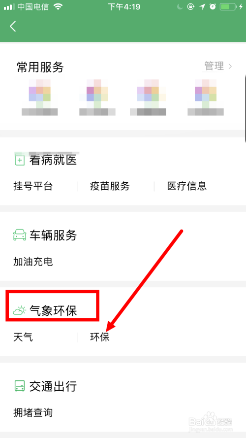 再在 城市办事 的页面里,找到 景象形象环保 下面的 环保 ,并点击进去 。
