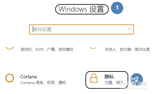 接着就会弹出Windows设置对话框,点击对话框中的“隐私”,然后在跳转到的页面最左侧拖动找到“后台应用”选项;