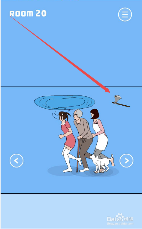 跑到下图所示的页面内,点击水池旁边的 斧子,然后在从头回到有井的页面内,在这个页面将斧子也扔到井下,这样弟弟就可以拿到斧子道具了。之后点击斧子用斧子将柜子劈开之后会发现里面是一根很长的绳索