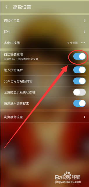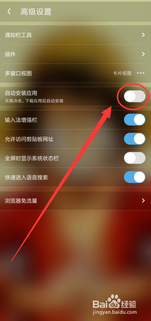点击后面蓝色的按钮,封闭主动安装应用,如图所示