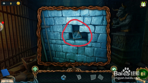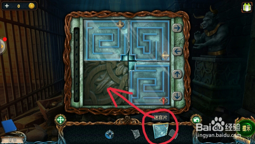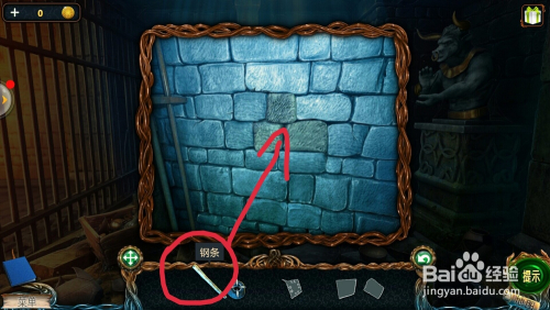 点击后面的石砖,用【钢条】撬开石砖,拿到【迷宫片】。