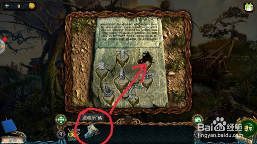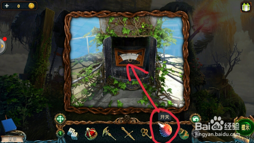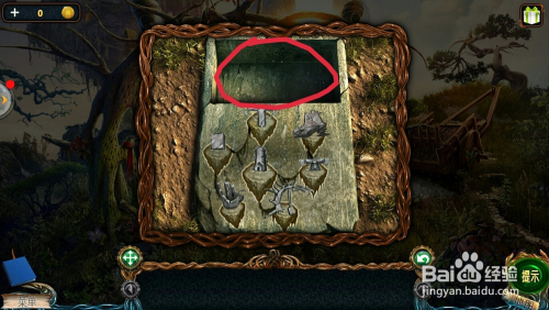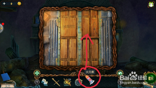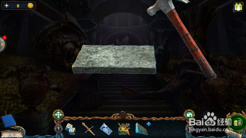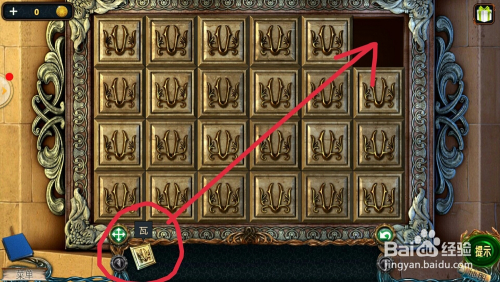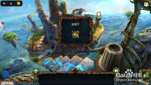点击左边的石柱上,看到箱子图形,把【金箱子】放在上面,拿到瓦;