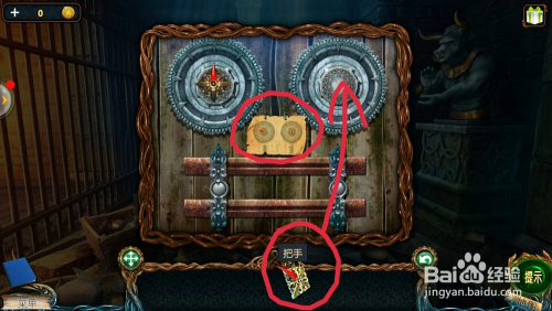 点击左边石座二楼,移开石头,拿到【把手】。