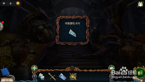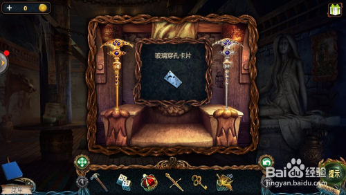 点击后面的椅子,把【谩骂权杖】放在左把手,拿到【玻璃穿孔卡片】;