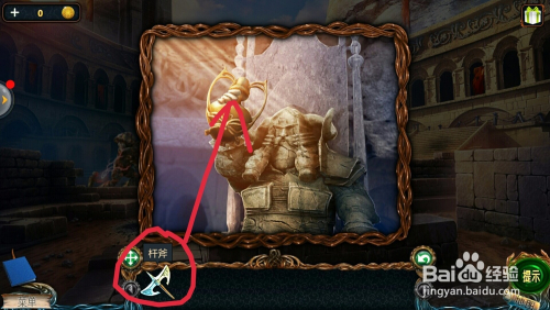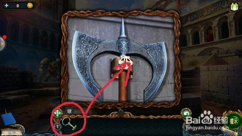 点击后面拿着金杯雕像下面的斧头刀,用【键】打开锁,拿到【杆斧】;
