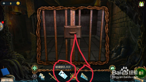 点击左边的铁网门,把【玻璃穿孔卡片】和【木制穿孔卡片】放进门锁;