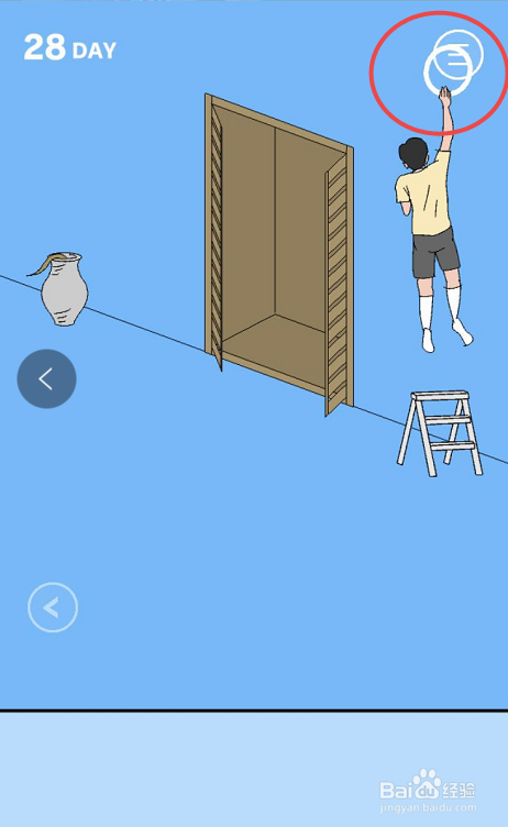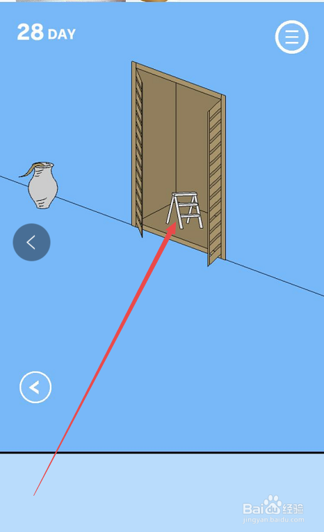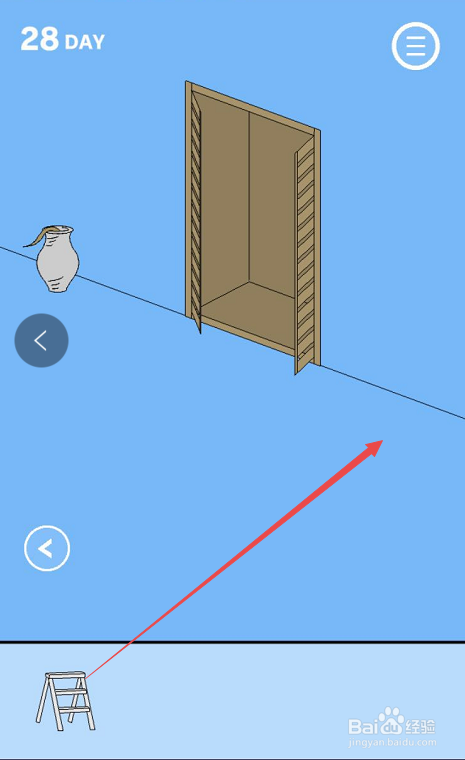 点击梯子收成梯子道具,需要注重的是不成以点击衣橱旁边的罐子,因为罐子里有蛇。拿到梯子之后点击梯子然后将梯子移到下图箭头所示的位置。