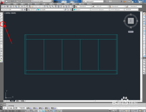 点击【直线东西】,在图示区域绘制一条直线线段。选中该线段,在号令栏中输入:co,对选边进行移动复制。点击【矩形东西】按图示绘制出一个矩形图案后,点击【偏移】按图示在号令栏中输入偏移量并按下空格键,完当作矩形的偏移操作(如图所示);