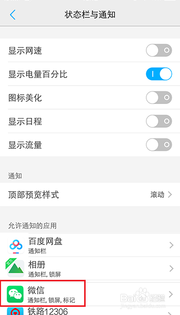 进入状况栏与通知页面,在通知下方,往下滑动页面,找到【微信】。
