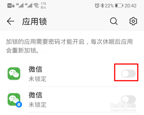 设置后再用锁界面,选择应用后方的开关来打开应用锁。