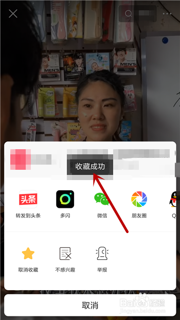 点击后会在分享界面中显示【保藏当作功】,这样就当作功的保藏了视频。