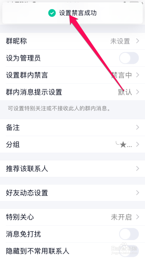 此时在置顶会有设置禁言当作功的提醒。