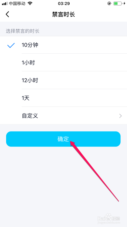 打弛禁言时长的界面选项中选择限制时候的禁言后再点击确定按钮。