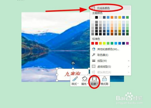 选中“九寨沟”,操纵弹出的文字东西进行字体、字号、颜色等的设置