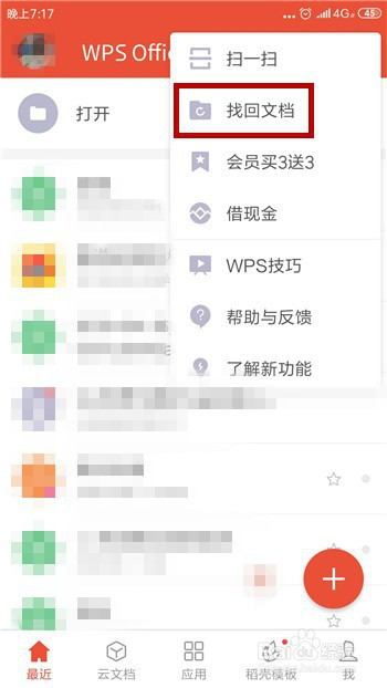 点击之后会呈现一排下拉菜单,找到并点击此中的【找回文档】。
