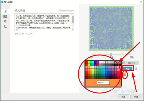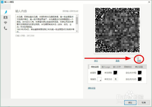 系统还能把“Logo”嵌入到二维码,只要单击“嵌入Logo”按照挨次操作即可。这里单击“嵌入文字”,嵌入“戎马俑”三个字