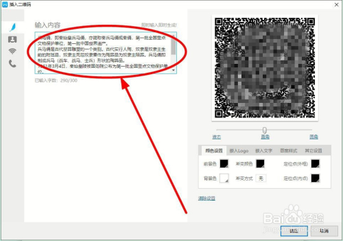 在弹出的”插入二维码“对话框中的输入内容中粘贴好筹办好的资料,注重文字部门要节制在300字之内。