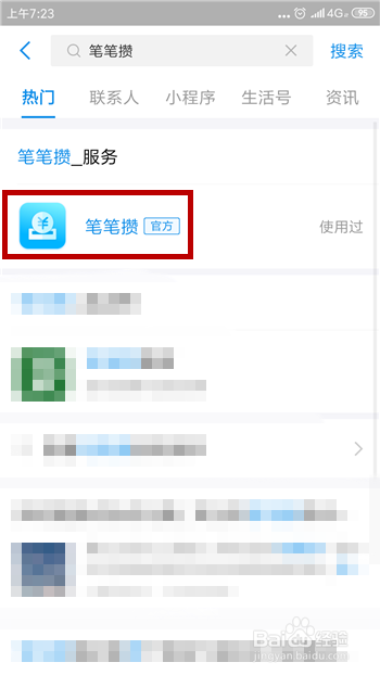 我们首先在支付宝里搜刮笔笔攒,在搜刮里点击打开笔笔攒。