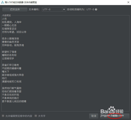点击左上角的文件,点击导入纯文本,选中事先筹办好的txt文本字幕,预览无误后点击继续。