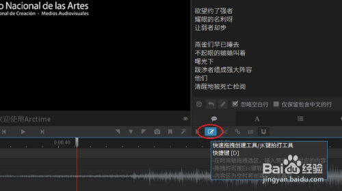 如图选择快速拖拽建立工具/JK键拍打东西,播放视频,此时我们就可以经由过程在时候轴上划动鼠标来添加字幕了。(在时候轴上,一句字幕会跟从鼠标移动,鼠标按下起头添加一句字幕,松开添加完毕,反复该步调添加后续字幕)