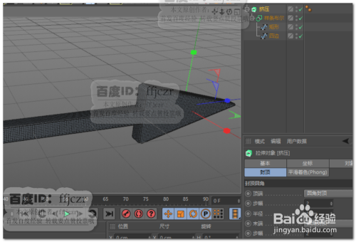 给样条布尔添加一个挤压,沿X轴挤压,数值为20;调整对象中的点插值体例为同一,两头圆角封顶,封顶中的类型为四边形,尺度网格;使箭头模子的内部网格平均。如图所示。