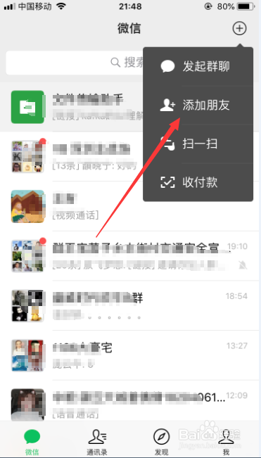 首先,打开并登录微信之后,进入微信本家儿页面,然后点击右上角的“+”,会弹出一个下拉框,选择此中的“添加伴侣”,如图所示。