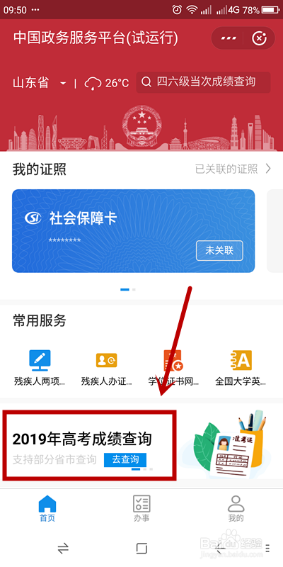 在平台页面找到“常用办事”下面的“高考绩绩查询”