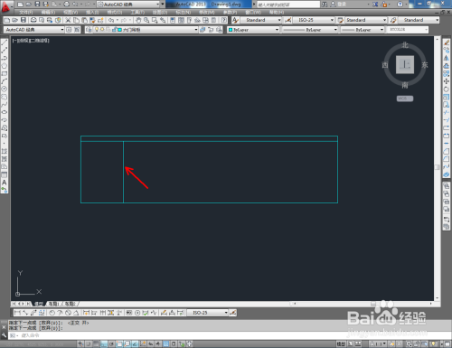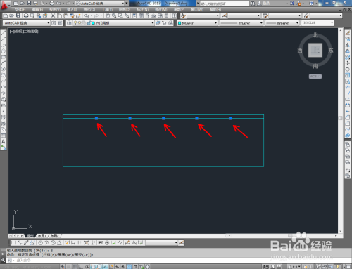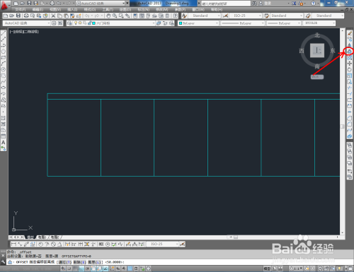 点击右边东西栏中的【偏移东西】,在号令栏输入偏移数值:50后,对顶边进行标的目的下偏移。选中该线,点击【画图】-【点】-【定命等分】,鼠标点击图示线段,在号令栏中输入:6并按下空格键,将选线等分为六等分(如图所示);