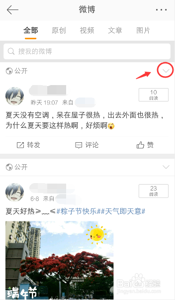 进入微博内容页面,选择你要点窜的微博,点击边上的倒三角,如图所示。