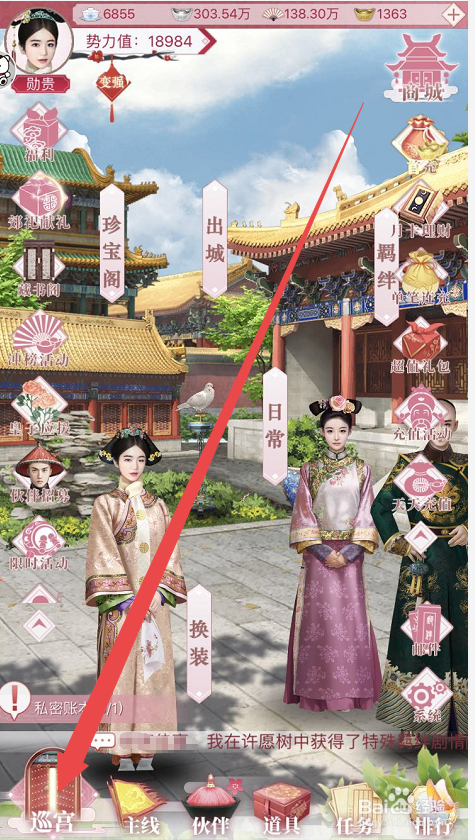 首先,点击宫廷秘传手游,选择本身地点的办事器,然后进入到游戏首页之后点击页面下方的“巡宫”按钮,进入到巡宫页面。