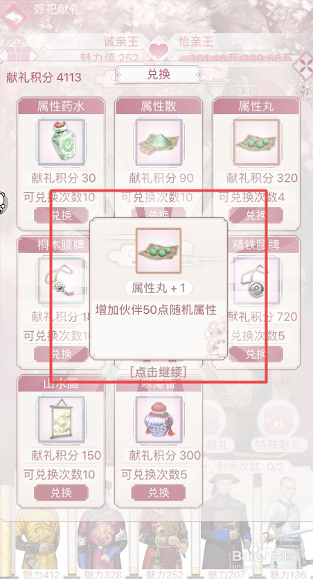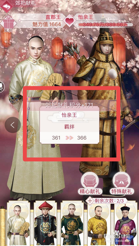 进入到郊祀献礼页面之后可以看见今天要献礼的对象,每一天的对象都是纷歧样的,今天小编给大师演示的就是给怡亲王献礼。点击怡亲王身前的“献礼”按钮。