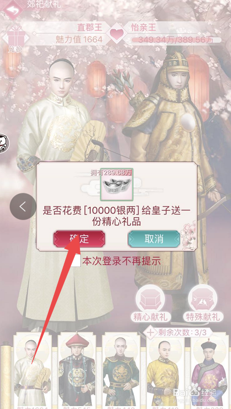 之后会呈现一个弹框,提醒需要耗损10000银两才可以给献礼对象送一份精心的礼品,点击确定就可以了。