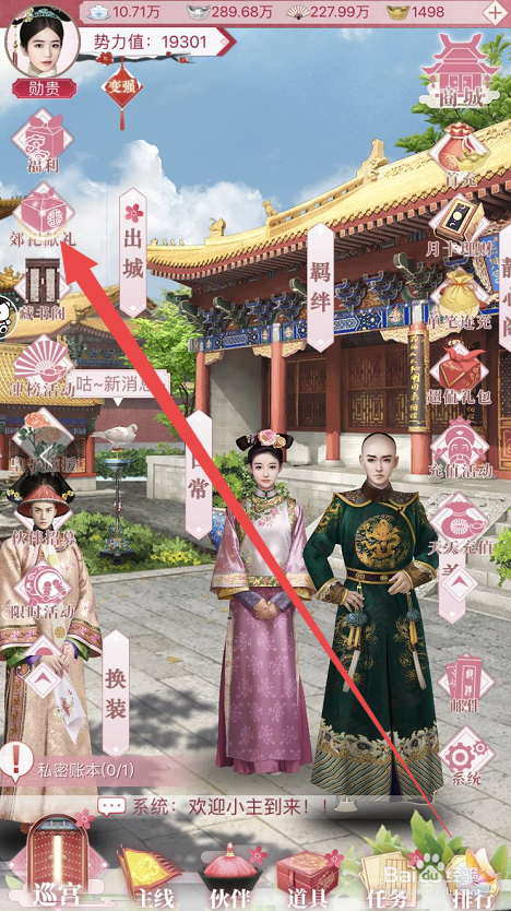 首先,进入到宫廷秘传手游的本家儿页面,在该页面内选择页面左侧的“郊祀献礼”按钮,当进口开启的时辰这里的按钮是闪灼的状况。