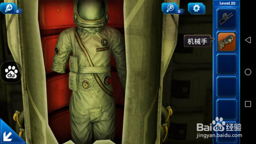 点击左面的设备,移动里面的方格将其融合,掏出里面的储存器。点击前方的太空服,将里面的机械手掏出起来。