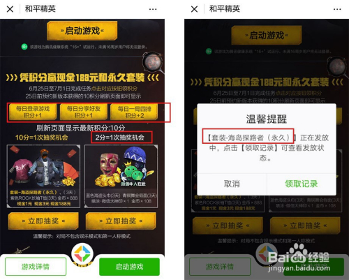 天天需要“登录游戏,分享老友,完当作一日四排”就可以堆集 2个积分也可以抽奖,或者再次堆集10个积分也可以获得其他奖励,如套装海岛探路者