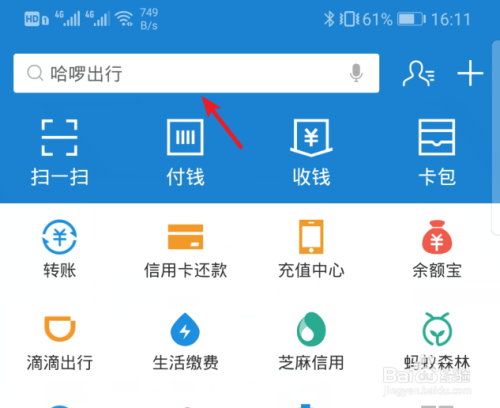 打开手机支付宝进入后,点击上方的搜刮选框。