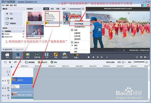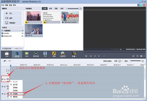 将视频和图片添加进来之后,我们先不焦急将它们添加到软件下方的轨道。这时辰我们将鼠标移动软件下方的“视频重叠轨”注重是视频重叠轨哦!然后鼠标右键选择“添加轨”,操作两次添加轨,这时辰软件下方就有三条“视频重叠轨”啦。