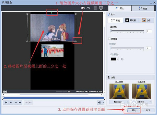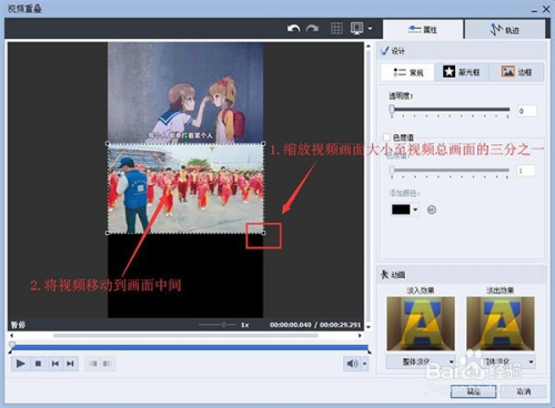 就像小编图片中的操作一样,接着点击右下方的“确定”按钮保留设置返回本家儿页面。这时辰用同样的体例进入到视频的视频重叠编纂页面。同样是调整视频画面的大小,与显示位置哦,操作方式见下图。视频要显示在画面的中心位置哦。