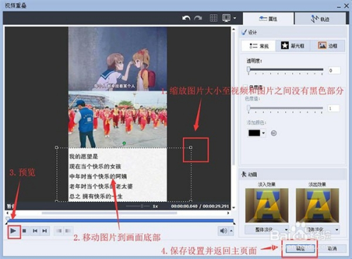接着就是设置画面底部的文字图片的显示位置和显示大小啦,同样的方式进入到视频重叠编纂页面,操作方式也与上面两个步调一样。就是将文字图片移动到画面底部就OK了。这时辰三个画面都调整完当作啦,就可以点击视频播放进行预览结果啦。
